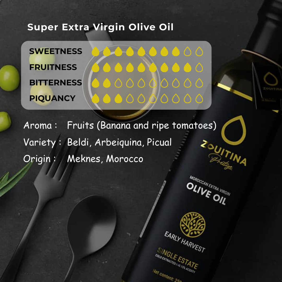 – Bagi menentukan minyak zaitun itu tergolong dalam kategori EVOO ianya hendaklah mempunyai nilai acidity yang kurang dari 0.80% dan untuk Prestige Zouitina mempunyai serendah 0.15%, dimana semakin rendah nilai acidity, semakin berkualiti dan semakin bermanfaat minyak zaitun yang diamalkan.